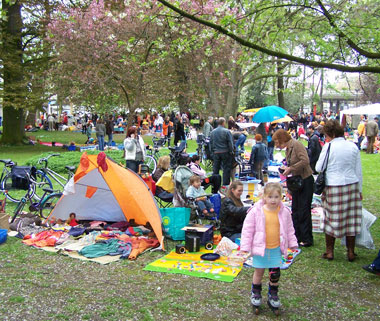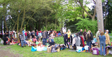 Vrijmarkt-shoppen doe je met je rolschaatsen op het gras. Op de achtergrond vergiftigt de bosnimf een klant met oranjecakejes.